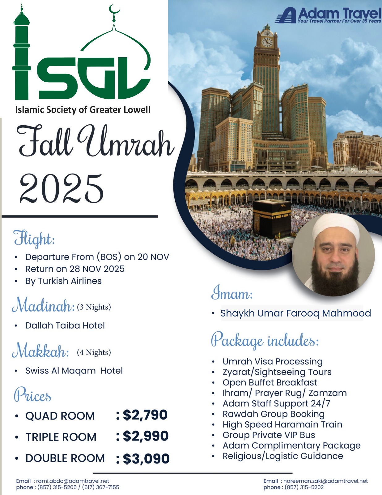 UmarahIslamic Society of Greater Lowell(ISGL) Fall-2025 Umrah As-Salamu Alaykum, ISGL Fall-2025 Umrah November 20th to November 28th Alhamdulillah, with the grace of Allah , we are pleased to announce that our Imam, Shaykh Umar will be leading a group for Umrah in November-2025. This blessed journey will be an opportunity for spiritual growth and strengthening our bond with Allah Please check the attached flyer and register directly through Adam Travel JazzakAllah