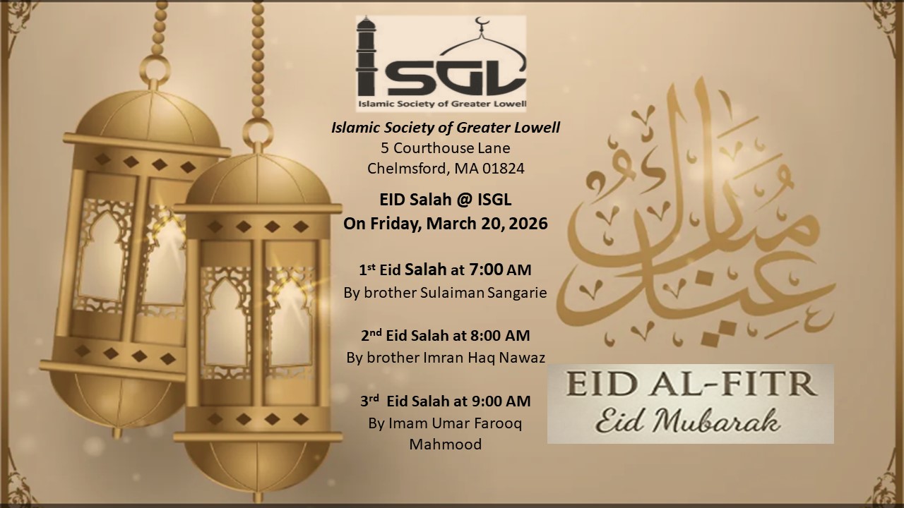 Eid Al FitrIslamic Society of Greater Lowell(ISGL) Celebrating the Joyous Occasion of Eid ul-Fitr Dear ISGL Community Members, Assalam-u-Alaykum, As the blessed month of Ramadan draws to a close, we look forward to celebrating the joyous occasion of Eid ul-Fitr with our loved ones and community members. Eid is a time for reflection, gratitude, and togetherness. It is a reminder of the strength, patience, and compassion we have shown during Ramadan, and an opportunity to share our blessings with those in need. On behalf of Islamic Society of Greater Lowell, I would like to extend my heartfelt wishes to you and your family for a blessed and peaceful Eid. May this day bring joy, prosperity, and peace into your lives, and may the spirit of Eid inspire us all to continue spreading kindness and love within our community. We are excited to come together to celebrate this special occasion. Let us remember those who may be struggling, and reach out with kindness and support. Please join us in making this Eid a time of unity, gratitude, and joy. ISGL will have three Eid-ul-Fitr Salahs: 7:00AM by Br Sulaiman Sangarie 8:00AM by Br Imran H. Nawaz 9:30AM by Imam Umar Farooq Mahmood ISGL encourages the community to attend 7:00AM and 8:00AM Salahs to avoid traffic jams and bottlenecks. Wishing you and your family a joyous and blessed Eid ul-Fitr!